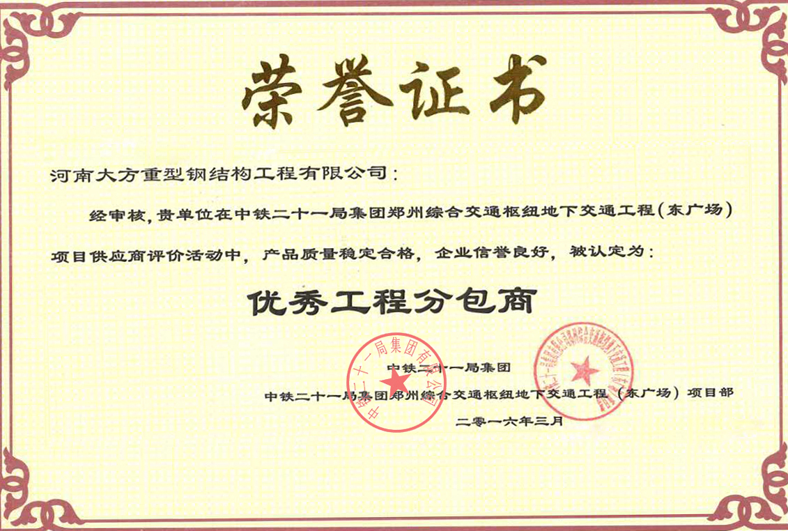 近日,從中鐵二十一局傳來喜訊,在鄭州綜合交通樞紐地下交通工程(東廣場)項(xiàng)目分包商評(píng)估活動(dòng)中,河南大方重型鋼結(jié)構(gòu)工程有限公司因產(chǎn)品質(zhì)量穩(wěn)定合格、交付及時(shí),企業(yè)信譽(yù)良好,提供優(yōu)質(zhì)服務(wù)被認(rèn)定為“優(yōu)秀工程分包商”。此項(xiàng)榮譽(yù)的獲得肯定了大方鋼構(gòu)在鄭州綜合交通樞紐地下交通工程(東廣場)項(xiàng)目中做出的積極貢獻(xiàn),也充分證明了中鐵二十一局集團(tuán)對(duì)大方鋼構(gòu)公司的信任。