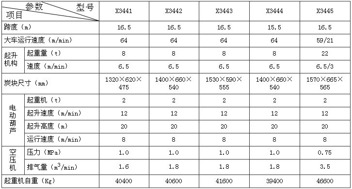該機由機械、電氣控制系統(tǒng)、氣動系統(tǒng)等部分組成,**套裝置可夾取陽極炭塊10塊,堆積6層;第二套裝置掛在橋架下部工字梁上的電動葫蘆,該電動葫蘆可沿工字鋼軌道移動,其吊鉤可用于車間內的單塊零星物品吊運工作。夾具裝置上的夾鉗打開和夾持動作都由氣動系統(tǒng)提供動力,起重機全部動作均可在操縱室內完成。